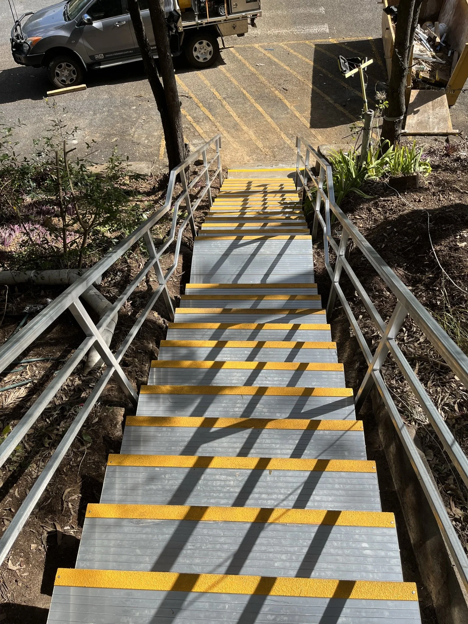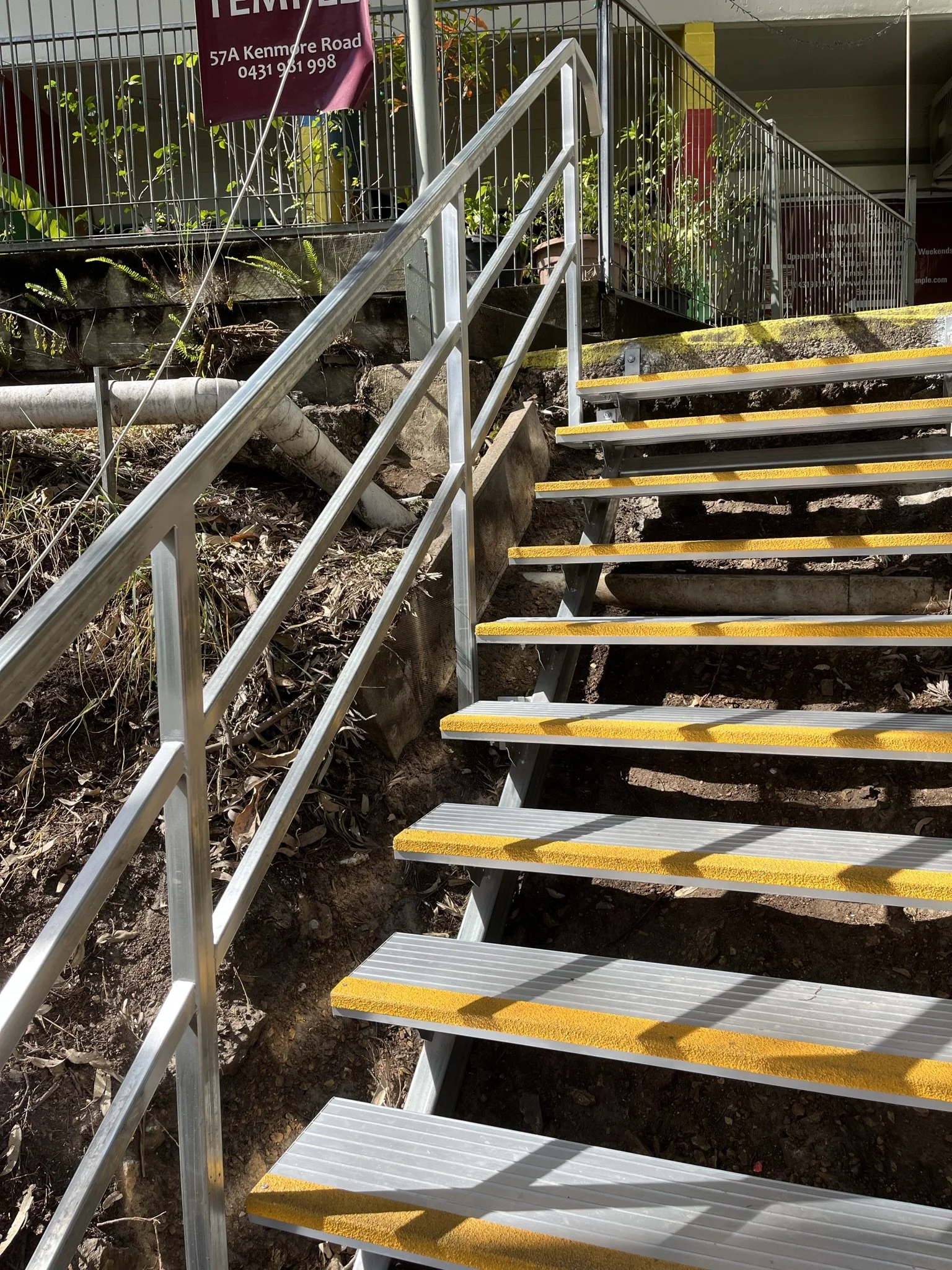 A sleek, custom-designed steel staircase located on the beachfront of the Gold Coast, offering both functional access and an artistic focal point. Its modern industrial design complements the natural beauty of the coastline, featuring sturdy steel treads and a minimalist railing that seamlessly blends with the sandy landscape.